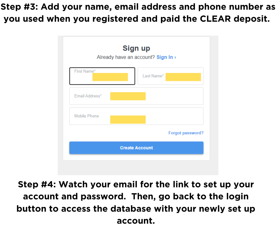 If you have never created a Ministry Platform login with us, you will need to use the "CREATE AN ACCOUNT" feature to get started. (See screen shots that follow for instructions.) When creating the account, please utilize the email that you used to register your child for CLEAR when you made your deposit.